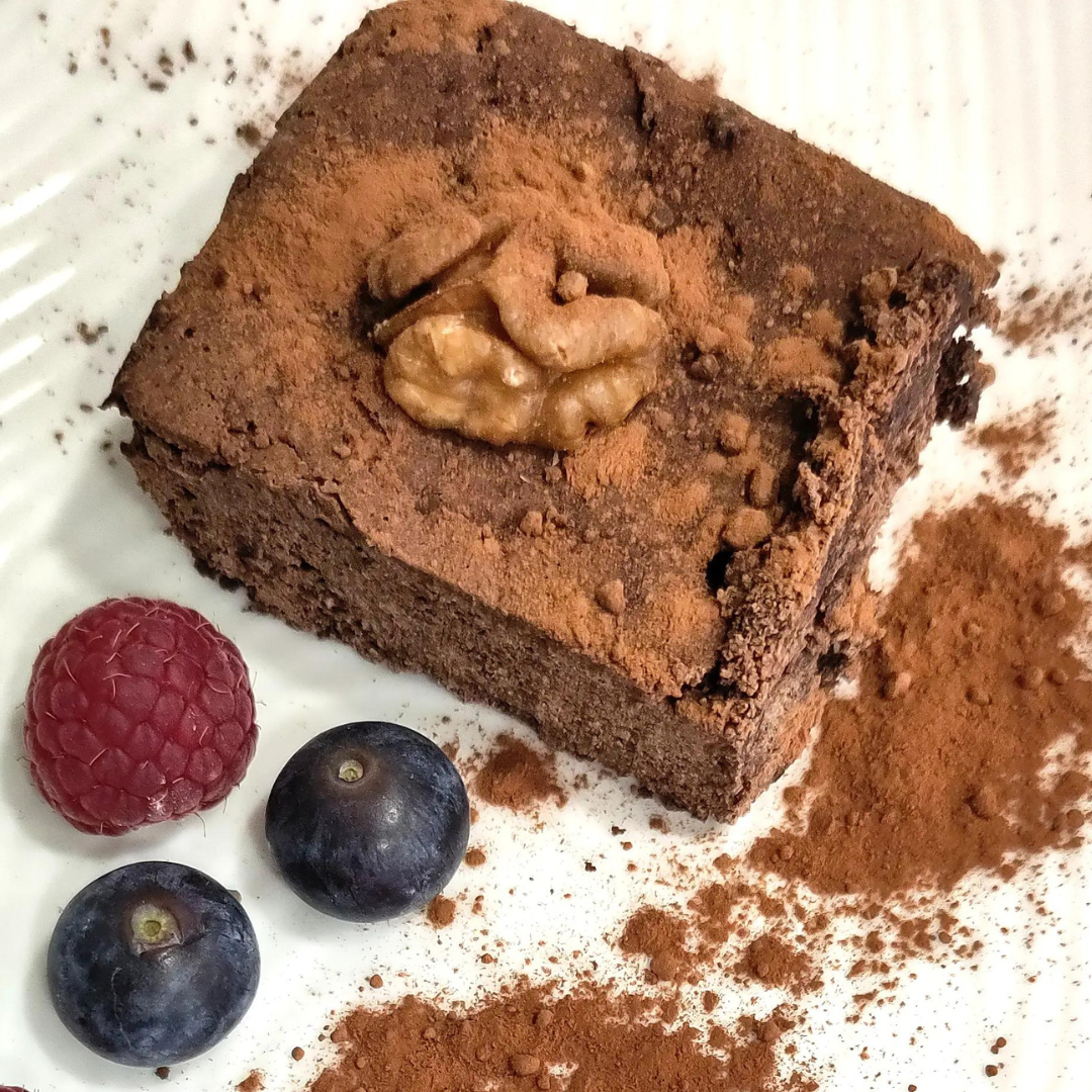 Brownie lliure de gluten i plant-based en format rodó de 26cm. Decorat amb xocolata fosa i nous.