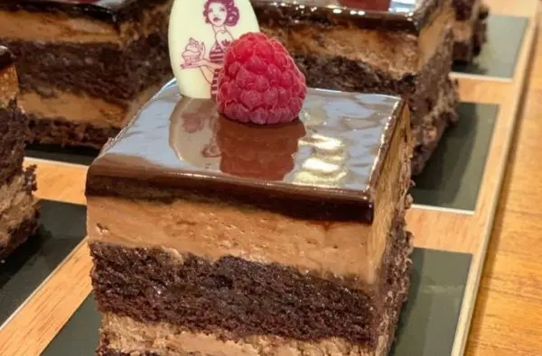 La clásica Sacher Torte con el toque de Eva. Bizcocho de chocolate, relleno de cremoso de chocolate y frambuesa con un satinado brillante de chocolate. La tentación perfecta.