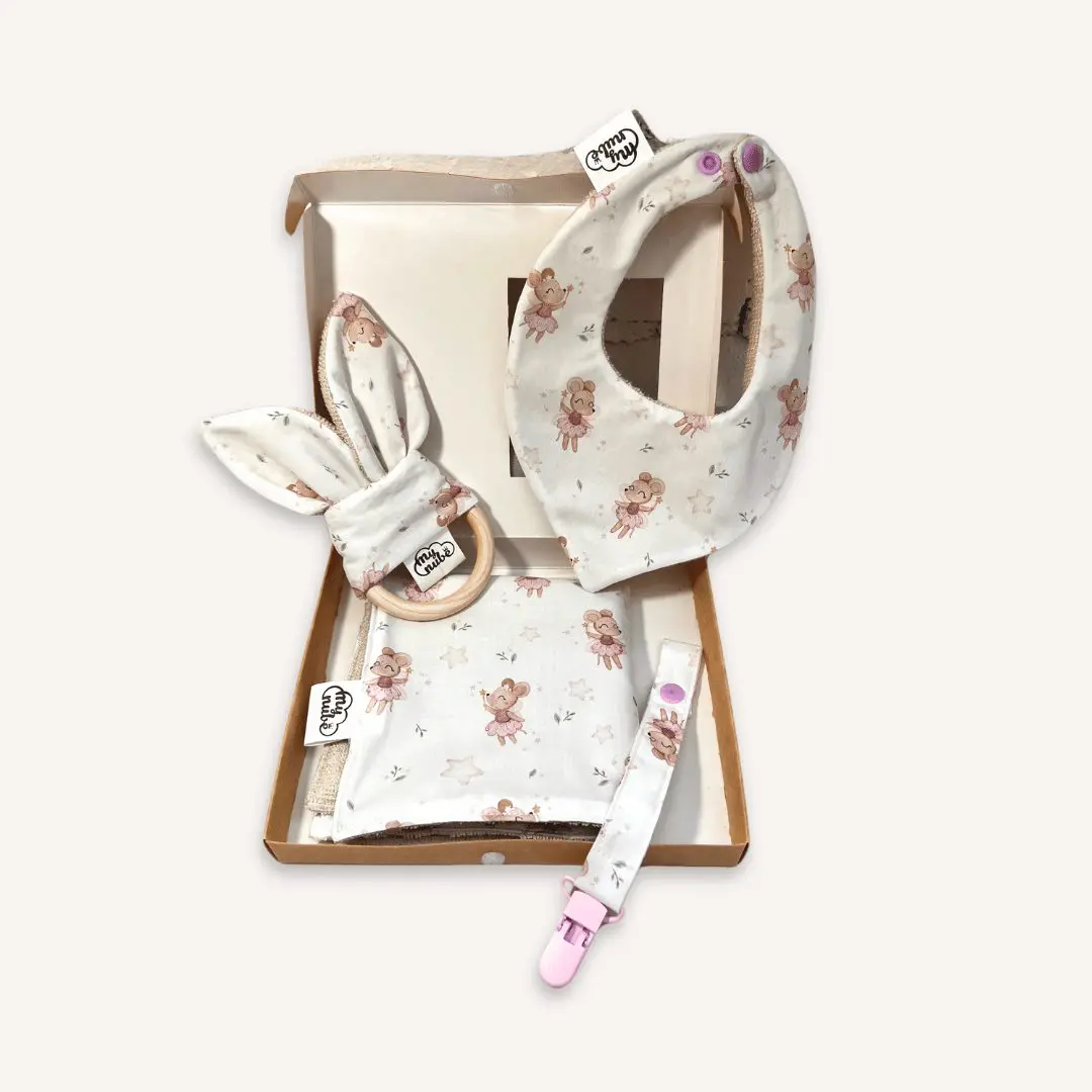Todos los artículos están confeccionados con materiales ecológicos como rizo de toalla de bambú y algodón orgánico, seleccionados por su suavidad, durabilidad y respeto por la piel sensible del bebé. Además, el mordedor incluye madera natural tratada, libre de productos químicos.