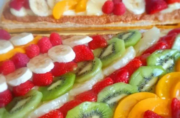 Elaborat amb una cruixent pasta fullada, cobert amb la nostra rica crema pastissera o la nostra nata especial, amb refrescant fruita de temporada.