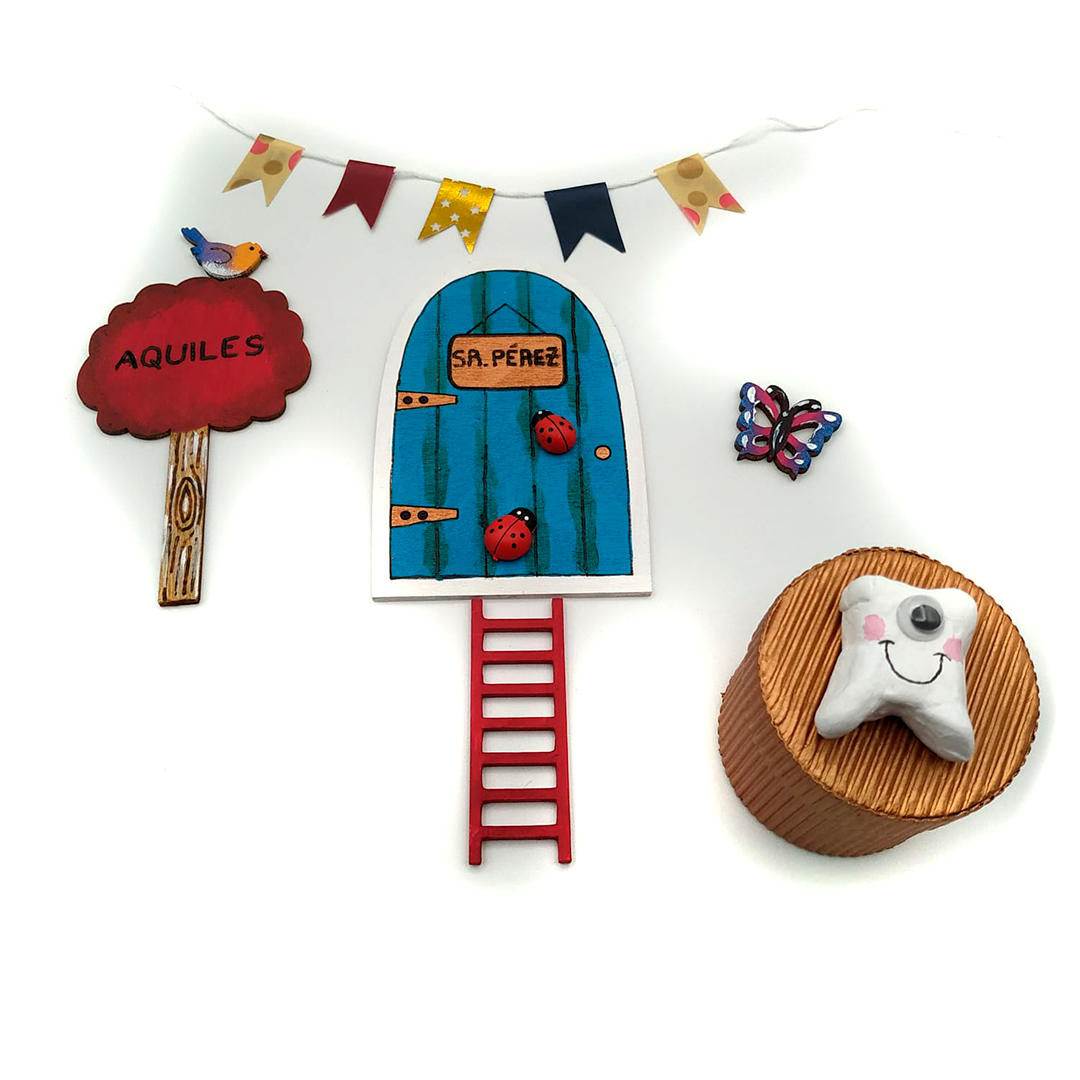 Llega ese momento especial… ¡La llegado del Sr. Pérez a casa! El set incluye: la puerta del Ratoncito Pérez decorada con dos mariquitas, unas escaleras para que el Sr. Pérez pueda salvar el zócalo y llegar a la puerta, árbol/letrero con el nombre de/la pequeño/a, banderola a juego, dos decoraciones aleatorias (pajaritos, mariposas o flores), caja para guardar los dientes y por último, el certificado oficial del Ratoncito Pérez.
